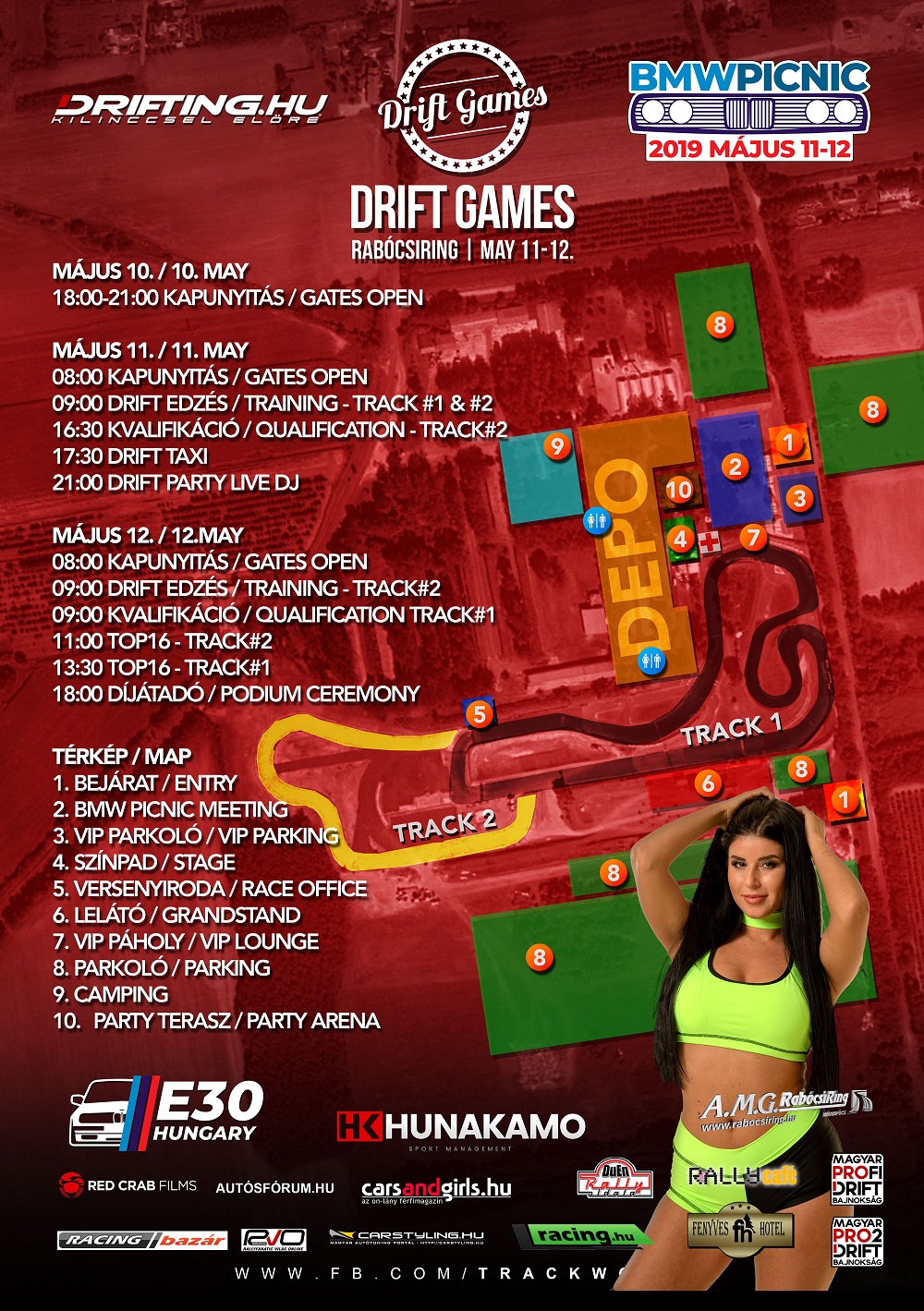 Május 11-én szombaton, a kvalifikációkat követően korlátozott számban, de lehetőség lesz bepattanni A pilóták mellé és drift taxizni ezen az izgalmas, fallal körülvett, nehéz pályán, mely biztosan örök élményt ad majd az utasoknak. A taxi után pedig mi más emelhetne még a hangulaton, mint egy fantasztikus drift party live DJ-vel a Rabócsiring teraszán.